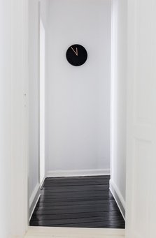 Gulvene virker nærmest læderagtige i deres udtryk og de sorte mellemrum leder tankerne hen på et solidt skibsdæk. Hver eneste mellemrum har Helle møjsommeligt bejdset mørke med en smal pensel for at få mellemrummene til at fremstå ensartede og med en grafisk effekt.