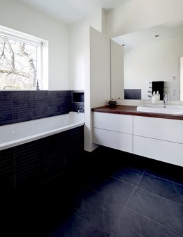 - De grå facadeplader på sydsiden er fra Ivarsson, mens nordfacaden er pudset med facadesystemet Sto Ventec. Denne hvidpudsede facade går også igen i den øvre ”ramme”, der omkranser hele huset.