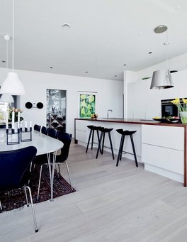 - I det store rum og værelserne er der lagt plankegulvlamel i hvidolieret eg, mens der i badeværelser, entré og køkken er klinkegulv i Evers Trendstone. Der er gulvvarme i hele huset.