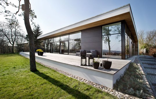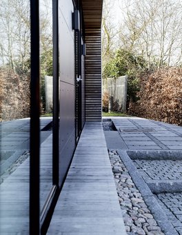 Når parret er hjemme, tilbringer de al deres tid i det store rum, som udgør både køkken, spise- og opholdsstue, og her har de naturen uden for på første parket. Gennem skydedøre kan de træde lige ud på en smuk træterrasse i varmebehandlet ask, og udhænget sørger for, at solen ikke overopheder rummet alt for meget. Fra soveværelset er der desuden udgang til en vestvendt, overdækket terrasse, hvor aftensolen kan nydes.