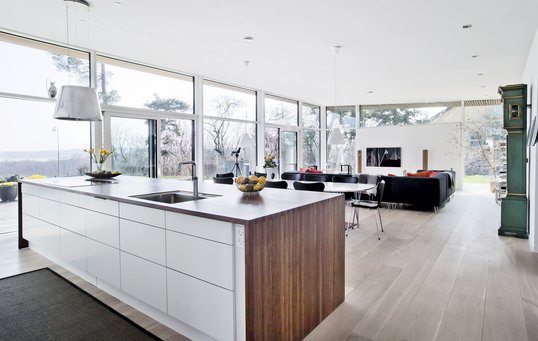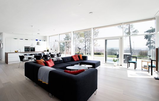 For selv om langt det meste af facaden mod sydøst består af glaspartier fra gulv til loft, er isoleringsevnen så effektiv, at selv en stiv januar-kuling, som den vi havde tidligere på året, ikke blev bemærket i rummet.