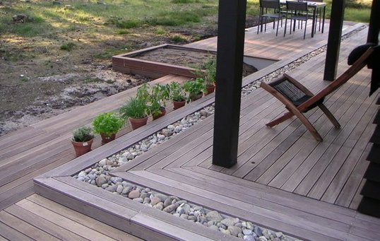 - Den har en overflade, som føles blød og kan virke mere varm og behagelig end en stenterrasse. Træ har også en hyggelig lyd, når man går på det.