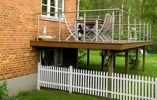 I nogle tilfælde vil trappen og værn koste det samme som resten af terrassen. Desuden skal du regne med, at der skal støbes punktfundamenter til en hævet terrasse.
