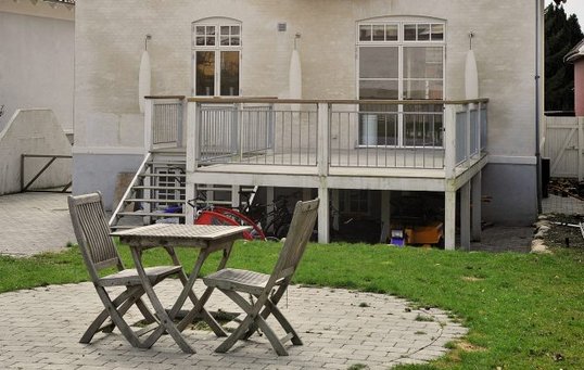 - En træterrasse bør hæves mindst 10 cm over jordniveau. Brug indstøbte stolpesko eller klods terrassen op på cementfliser.