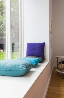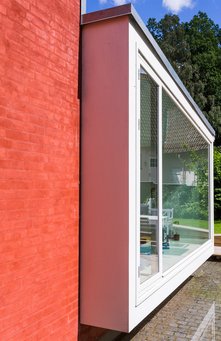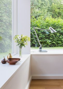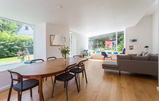 Der var ikke så meget at rafle om, når det kom til tilbygningens placering. Den kunne kun placeres ét bestemt sted på grunden, men det ville adskille haven fra det oprindelige hus. Det problem blev løst ved at opføre tilbygningen med store vinduer i gavlene, så man fra det gamle hus kan få det lange kig gennem tilbygningen og videre ud i haven, der skråner opad.