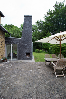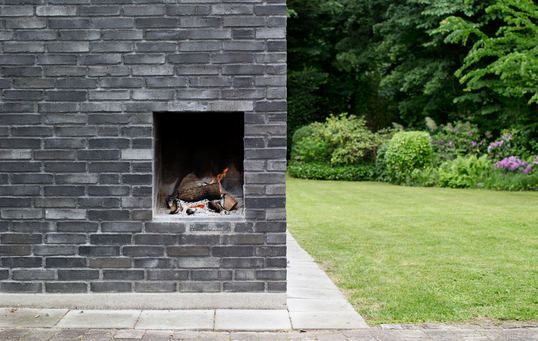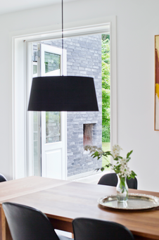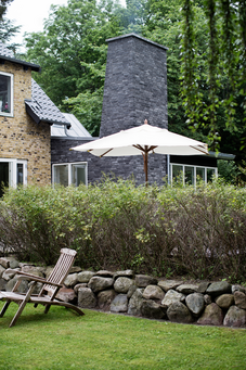- Men mellem alle de vandrette forløb mellem hus og tilbygning manglede der i kompositionen noget, som gik den anden vej – altså lodret. Og da familien samtidig havde ytret ønske om at få en pejs inde og også gerne ude, arbejdede jeg videre med ideen med skorstenen, fortæller Tom Mose Petersen.