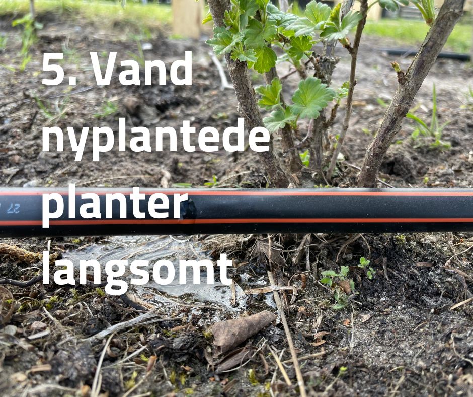 Giv nyplantede træer og buske 1-2 kander vand pr. plante, svarende til 10-20 liter, 1-2 gange om ugen eller brug vandingsposer eller sække, som skal fyldes op 1-2 gange om ugen. Dæk evt. jorden rundt om træer og buske med dækbark eller et lag kompost for at holde på fugtigheden.