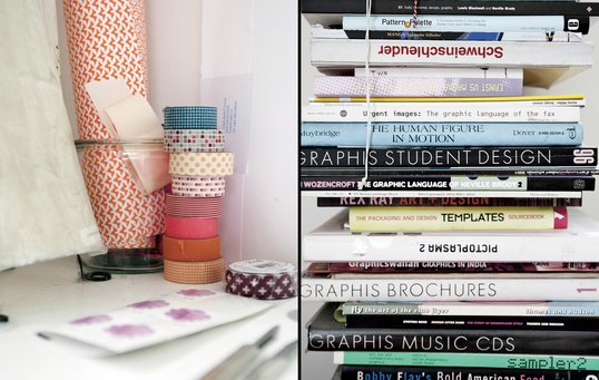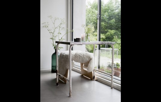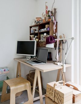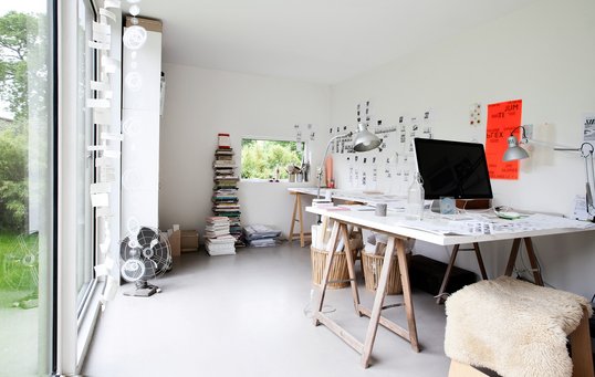 Anne Solmers tegnestue i tilbygningen vender mod haven og har store vinduespartier fra gulv til loft. Bukkene med bordplader på er en hjemmelavet løsning. Foto: Christina Kayser Onsgaard