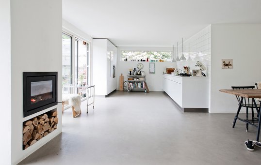 - Herudover har huset fået nye, store vinduespartier overalt, nyt køkken i forbindelse med stuen og et funktionelt og moderne cementpuds-gulv med varme under, der flyder igennem alle husets rum.