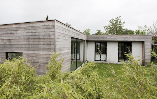 Den rigtige retning viste sig at være et skarpt vinkelhus pudset op med beton og delvist beklædt med cedertræ. Med værelser nok til familien på fem og et stort alrum, hvor stue, spisekrog, køkken ligger med næsen mod solen og den hyggelige grund for fødderne. Arkitekterne holdt fokus på at bevare de rene linjer og bygge videre på de funktionaliteter, som det gamle hus havde.