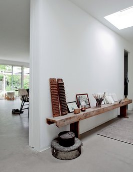 Værelsesgangen støder vinkelret på gangen mellem stuen og tilbygningen. Den er indrettet med et gammel loppefund af en bænk, fyldt med rejseminder og lys. Foto: Christina Kayser Onsgaard