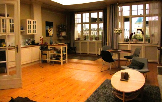 Lykkes lejlighed findes i virkeligheden og ligger på det smukke Frederiksberg Allé. Lejligheden er desuden bygget op i et studie, og det var studie-lejligheden, vi så, når vi så Lykke inde i lejligheden.
