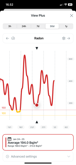 hun blev født i og har boet der i alle årene. Jeg har sat en radonmåler op i hendes stue og har observeret den over flere mdr. og her i januar 2025 har målingerne svinget meget (det er helt normalt ved jeg), fra 131 til 646 og gennemsnittet for denne mdr. var 304 Bq/m3 (se vedhæftede billede med graf)