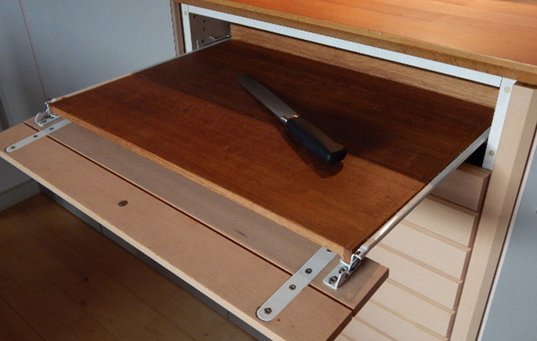 Eftersom køkkenerne ofte blev bygget på stedet, kunne man tilpasse udtræksskærebrættet, så det fik den mest praktiske størrelse og placering i det funktionelle køkken.