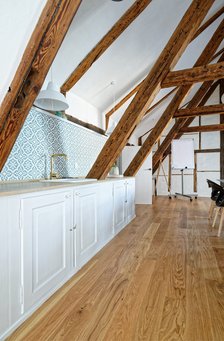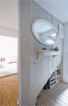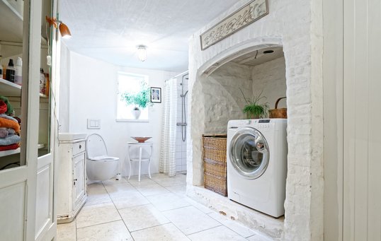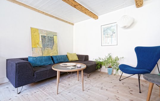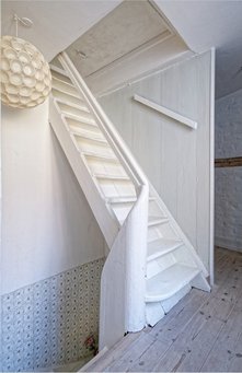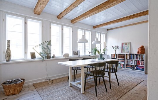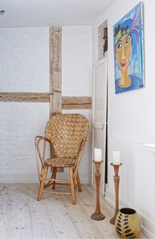 – Vores bolig ligger genialt som en hjemlig oase bag den travle handelsgade og et stenkast fra tog og færge. Man fornemmer, hvordan det har været, da husrækken lå helt ned til stranden, så købmænd og materialhandlere kunne forsyne skibene, der lå på red uden for byen. Måske netop derfor har det været vigtigt for os at kombinere de nostalgiske omgivelser med moderne løsninger. Det skal ikke være et museum, vi bor i, fortæller Ulla, som dog har benyttet genbrugsmaterialer og loppefund mange steder i boligen.